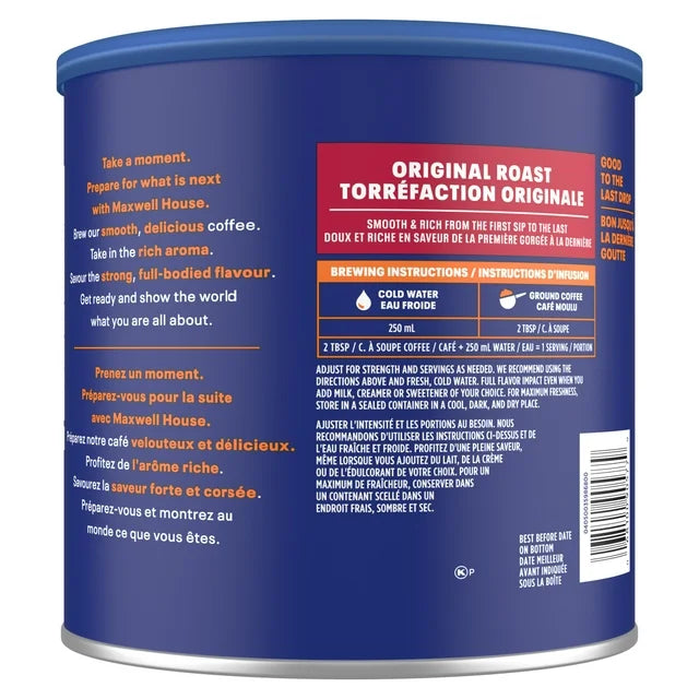 Smooth and rich from the first sip to the last drop, A consistently great taste that you can brew to take your day "to your max", Give your brain a break, unplug a little and gear up for what's next with a cup of Maxwell House coffee, Prepare with cold water for breakfast or a quick pick-me-up any time of day